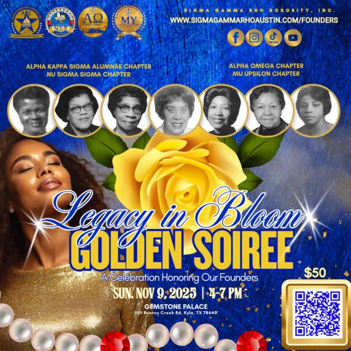 Join the Golden Ladies of Alpha Kappa Sigma for the Founder's Day Legacy in Bloom Golden Soirée on Sunday, November 9, 2025, from 4 PM to 7 PM at Gemstone Palace, Kyle, TX. Celebrate legacy, sisterhood, and impact in a beautiful evening gathering.